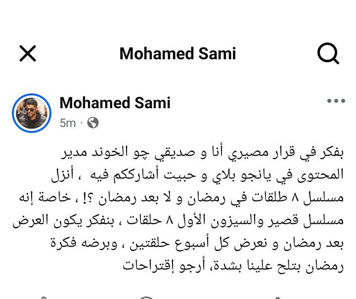وكتب محمد سامي في منشور رصده موقع تحيا مصر، على حسابها الرسمي بموقع التواصل الاجتماعي فيسبوك: بفكر في قرار مصيري أنا و صديقي چو الخوند مدير المحتوى في يانجو بلاي و حبيت أشارككم فيه ، أنزل مسلسل ٨ طلقات في رمضان و لا بعد رمضان ؟! ، خاصة إنه مسلسل قصير والسيزون الأول ٨ حلقات ، بنفكر يكون العرض بعد رمضان و نعرض كل أسبوع حلقتين ، وبرضه فكرة رمضان بتلح علينا بشدة، أرجو إقتراحات.
