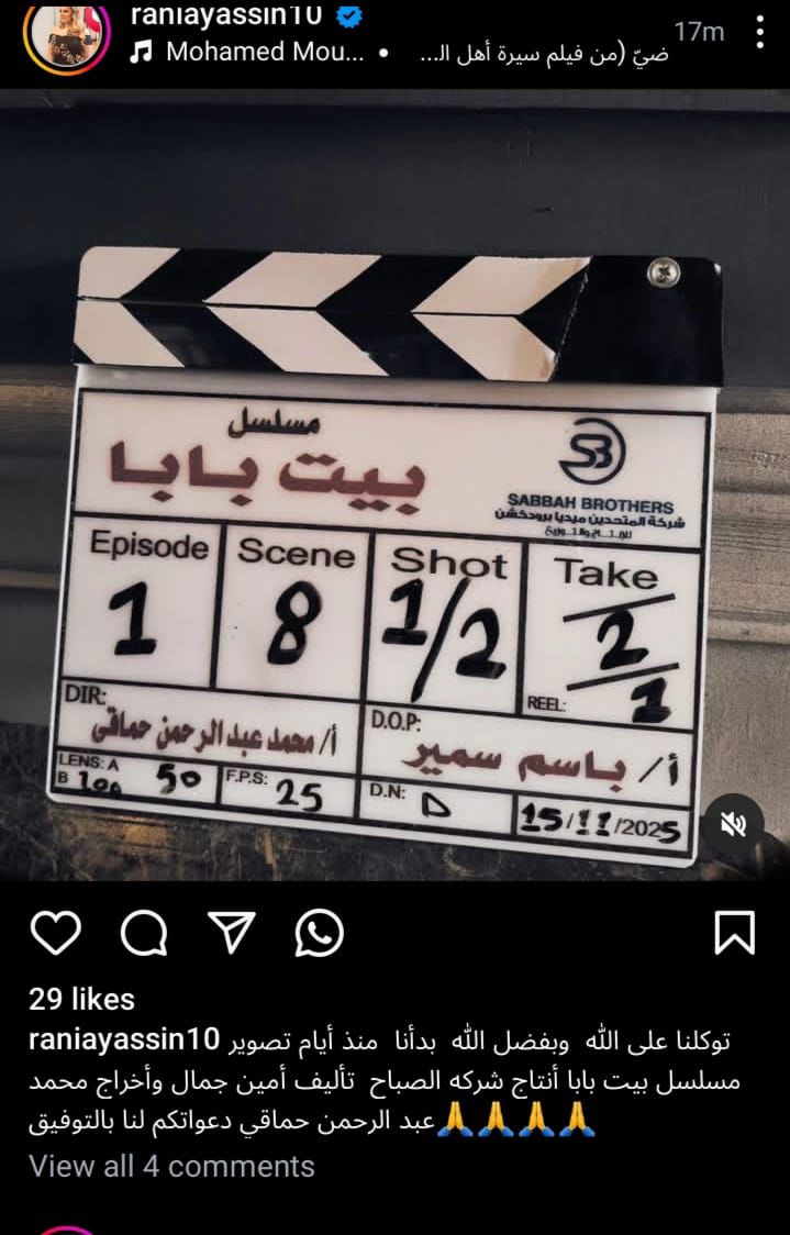 وشاركت الفنانة رانيا محمود ياسين، صورة كلاكيت مسلسلها الجديد ببت بابا، وفقا لما رصده موقع تحيا مصر، عبر صفحتها الرسمية على موقع التواصل الاجتماعي إنستجرام، وعلقت عليها: توكلنا على الله وبفضل الله بدأنا منذ أيام تصوير مسلسل بيت بابا أنتاج شركه الصباح تأليف أمين جمال وأخراج محمد عبد الرحمن حماقي دعواتكم لنا بالتوفيق.