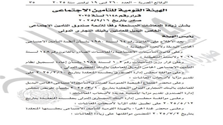 زيادة المعاشات.. في خطوة جديدة تستهدف دعم فئات محددة من أصحاب المعاشات، أصدرت الهيئة القومية للتأمينات الاجتماعية قرارًا رسميًا يقضي بزيادة معاشات المنتفعين من بعض الأنظمة التأمينية الخاصة، وذلك في إطار تطبيق أحكام قانون التأمينات الاجتماعية رقم 148 لسنة 2019 ولائحته التنفيذية. القرار الجديد، الصادر تحت رقم 6148 لسنة 2025، ونُشر في العدد رقم 260 من جريدة الوقائع المصرية بتاريخ 19 نوفمبر 2025، جاء ليقدم معالجة دقيقة لأوضاع مجموعة من العاملين السابقين الخاضعين لأنظمة تأمينية بديلة، مثل النظام الخاص بالعاملين في البنك التجاري الدولي.