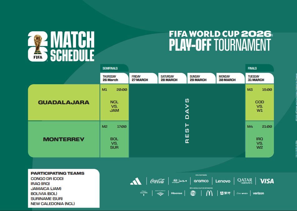 وحسبما ذكر “فيفا” في بيان رسمي، فإن مدينة جوادالاخارا، ستستضيف منافسات المسار الأول الذي يضم منتخبات كاليدونيا الجديدة وجامايكا وجمهورية الكونغو الديمقراطية، بينما تستضيف مونتيري منافسات المسار الثاني الذي يضمّ منتخبات بوليفيا وسورينام والعراق.
