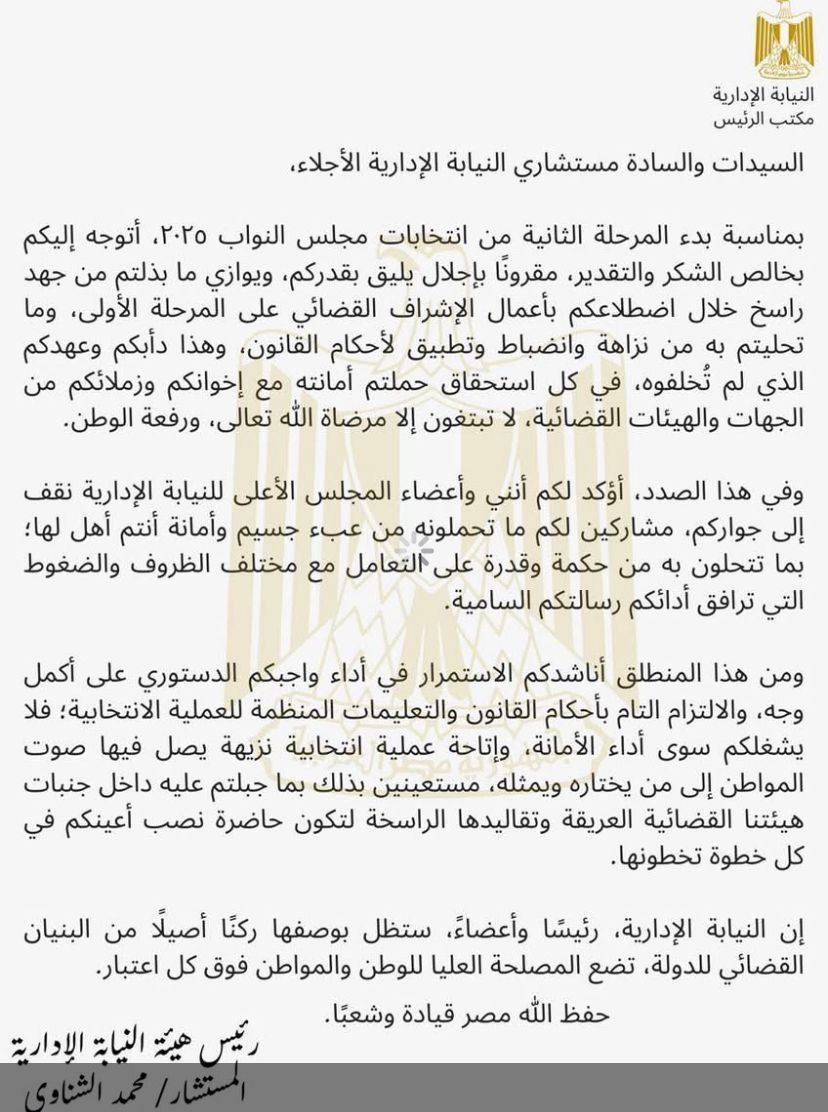 وجاء في نص البيان: السيدات والسادة مستشاري النيابة الإدارية الأجلاء بمناسبة بدء المرحلة الثانية من انتخابات مجلس النواب 2025، أتوجه إليكم بخالص الشكر والتقدير، مقرونا بإجلال يليق بقدركم ويوازي ما بذلتم من جهد راسخ خلال اضطلاعكم بأعمال الإشراف القضائي على المرحلة الأولى، وما تحلیتم به من نزاهة وانضباط وتطبيق الأحكام القانون، وهذا دأبكم وعهدكم الذي لم تخلفوه في كل استحقاق حملتم أمانته مع إخوانكم وزملائكم من الجهات والهيئات القضائية، لا تبتغون إلا مرضاة الله تعالى، ورفعة الوطن.