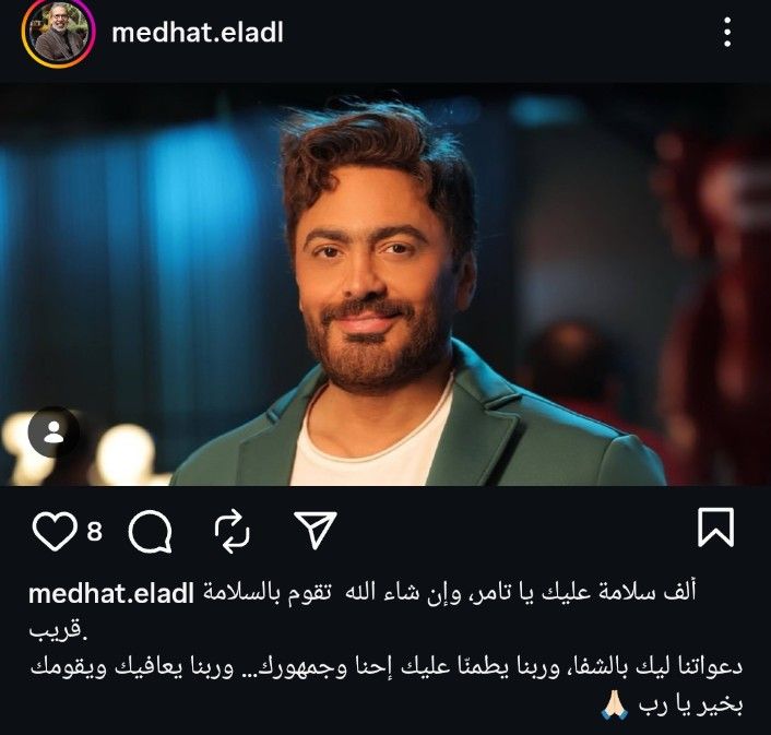 وجّه السيناريست مدحت العدل رسالة مؤثرة إلى النجم تامر حسني عبر حسابه الرسمي على موقع انستجرام، دعا فيها جمهوره ومحبيه إلى الدعاء لتامر بعد خضوعه لعملية جراحية دقيقة في ألمانيا.