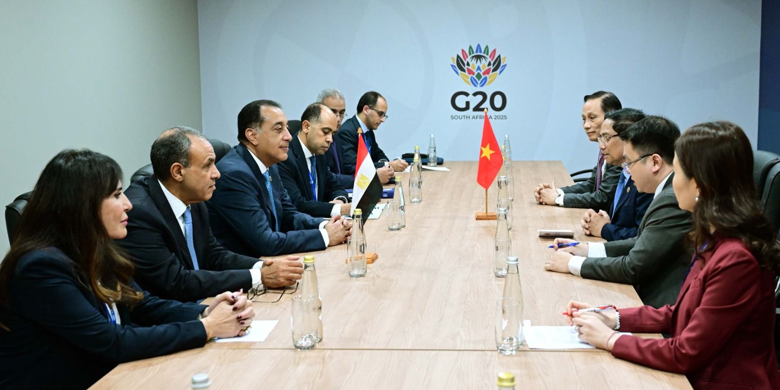 على هامش مشاركته نيابة عن الرئيس عبد الفتاح السيسي، رئيس الجمهورية، في قمة مجموعة العشرين (G20) لعام 2025 بمدينة "جوهانسبرج" في جنوب أفريقيا، التقى الدكتور مصطفى مدبولي، رئيس مجلس الوزراء، اليوم، فام مينه تشين، رئيس وزراء فيتنام، وذلك بحضور الدكتور بدر عبد العاطي، وزير الخارجية والهجرة وشئون المصريين بالخارج، والسفير أحمد علي شريف، سفير مصر في جنوب أفريقيا.