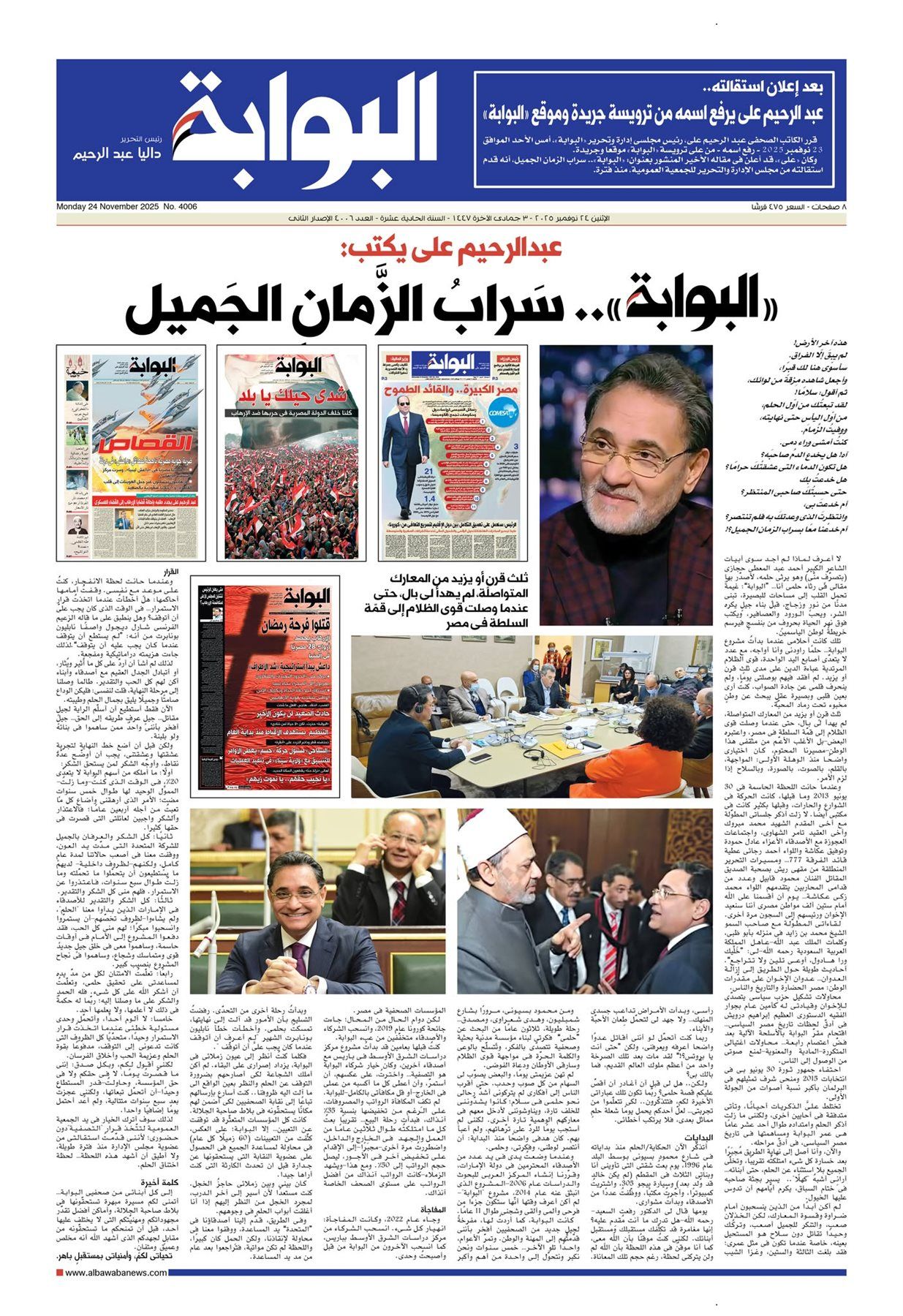 تقرأ غدًا في العدد الجديد من جريدة «البوابة»، الصادر بتاريخ الأثنين 24 نوفمبر 2025، مجموعة من الموضوعات والانفرادات المهمة، ومنها: