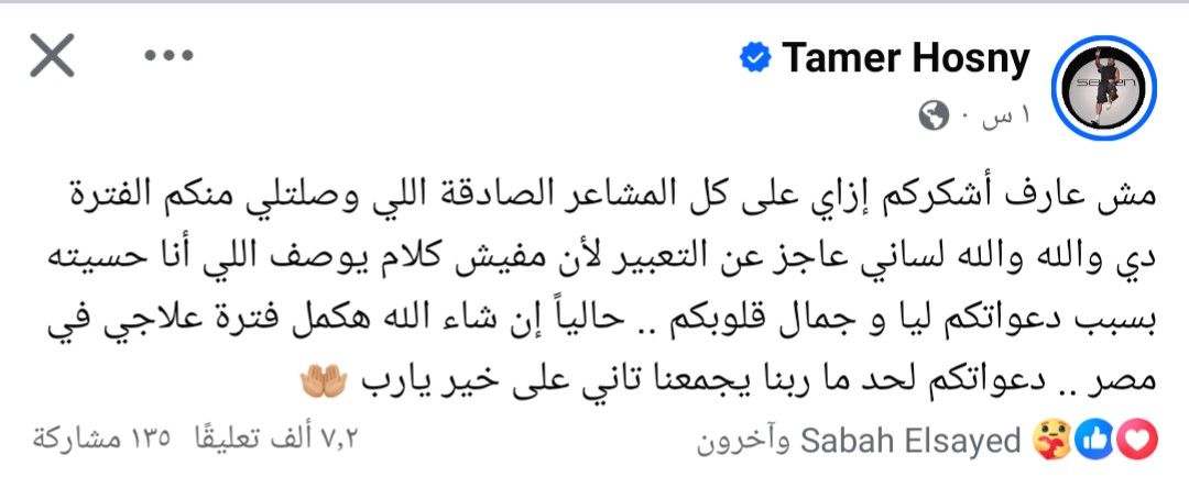 "مش عارف أشكركم إزاي على كل المشاعر الصادقة اللي وصلتلي منكم الفترة دي. والله لساني عاجز عن التعبير، مفيش كلام يوصف اللي أنا حسيته بسبب دعواتكم ليا وجمال قلوبكم".