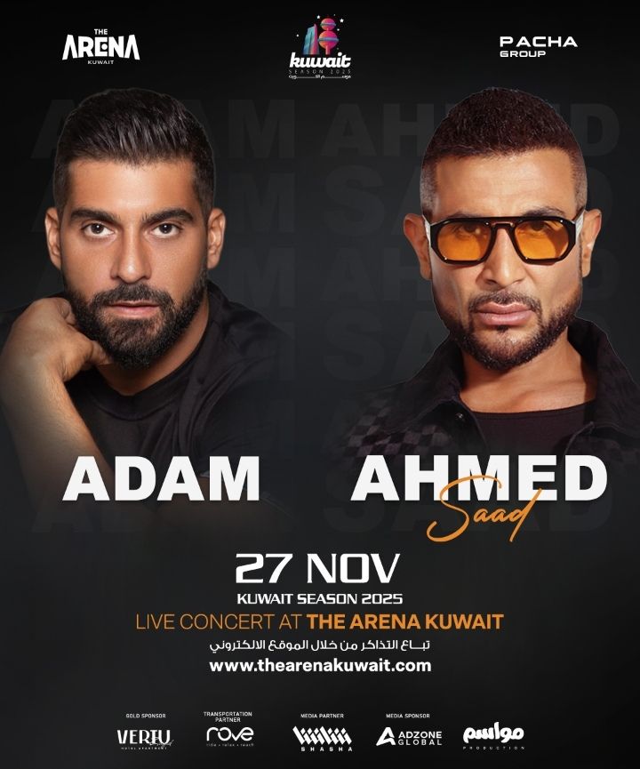 تستعد الكويت لاستقبال ليلة فنية مميزة يوم الخميس 27 نوفمبر على مسرح الأرينا، أحد أكبر الصروح الفنية في البلاد، حيث يلتقي النجمان أحمد سعد وآدم في حفل استثنائي يجمع بين الطرب الأصيل والحماس والإبهار البصري.