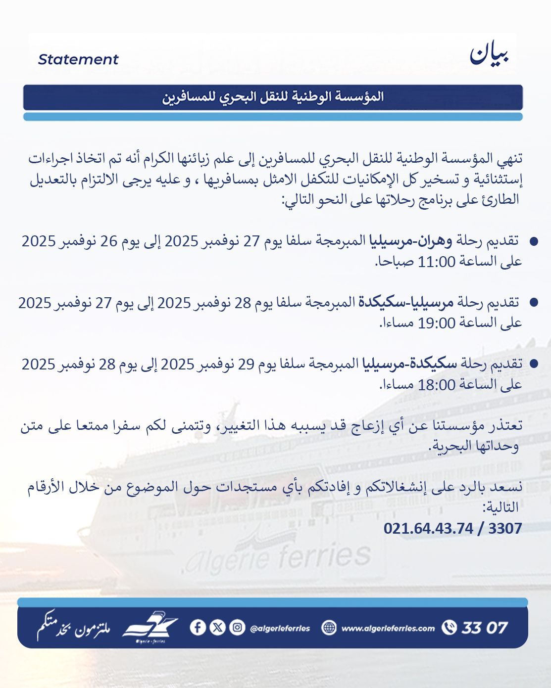 كما تم تقديم رحلة سكيكدة – مرسيليا المبرمجة سلفا يوم 29 نوفمبر 2025 إلى يوم 28 نوفمبر 2025 على الساعة 18:00 مساءا.