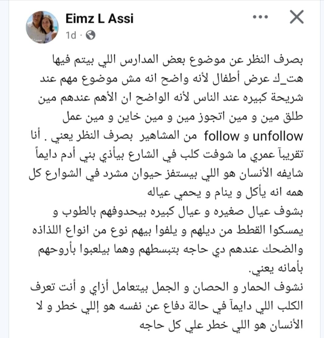 وأضافت العاصي: "أنا تقريباً عمري ما شوفت كلب في الشارع بيأذي بني آدم، دايماً شايفه الإنسان هو اللي بيستفز حيوان مشرد في الشوارع كل همه انه يأكل و ينام و يحمي عياله، بشوف عيال صغيرة و عيال كبيرة بيحدفهم بالطوب و يمسكوا القطط من ديلهم و يلفو بيهم نوع من أنواع اللذة والضحك عندهم دي حاجة بتبسطهم وهم بيلعبوا بأرواحهم بأمانة يعني، نشوف الحمار والحصان والجمل بيتعامل إزاي وأنت تعرف الكلب اللي دايماً في حالة دفاع عن نفسه هو اللي خطر ولا الإنسان هو اللي خطر على كل حاجة".