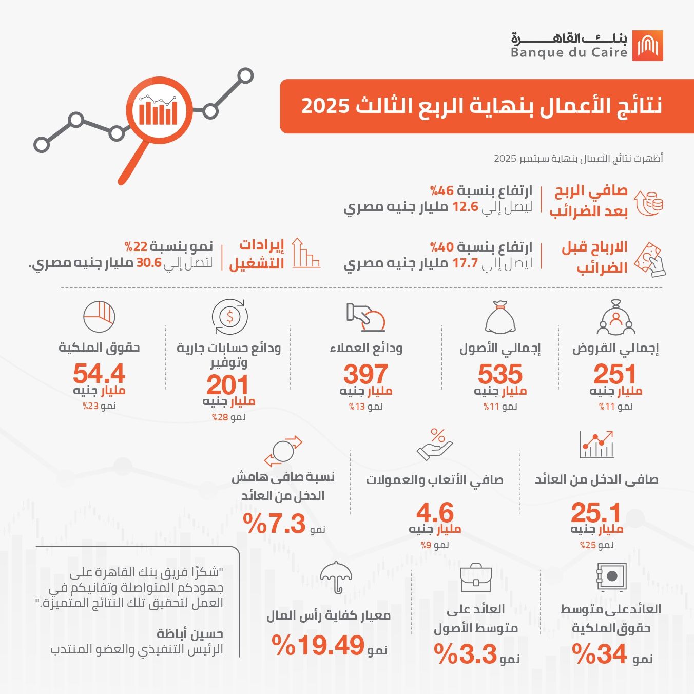 ارتفعت الأرباح قبل الضرائب لبنك القاهرة بنهاية سبتمبر 2025، بنسبة 40% مدفوعة بتحسن نتائج أعمال البنك في مختلف القطاعات ومن أبرزها التجزئة المصرفية، الخزانة، ائتمان الشركات، والمشروعات الصغيرة والمتوسطة.