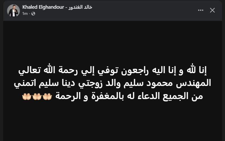 تحيا مصر، وكتب خالد الغندور عبر حسابه الرسمي"فيس بوك": إنا لله و إنا اليه راجعون توفي إلي رحمة الله تعالي المهندس محمود سليم والد زوجتي دينا سليم اتمني من الجميع الدعاء له بالمغفرة و الرحمة".