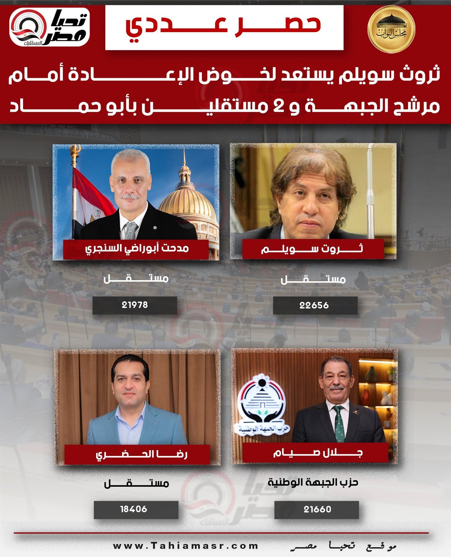وحصل المرشح المستقل ثروت سويلم على 22656 صوتا، كما حصل المرشح المستقل الثاني مدحت أبو راضي على 21978 صوتا، فيما حصل مرشح حزب الجبهة الوطنية على عدد أصوات بلغ 21660 صوتا، وبينما حصل المرشح المستقل الأخير رضا الحضري على عدد اصوات يبلغ 18406 صوتا، ويخوض جميعهم جولة الإعادة من أجل حجز المقعدين المخصصين للدائرة داخل البرلمان الجديد.