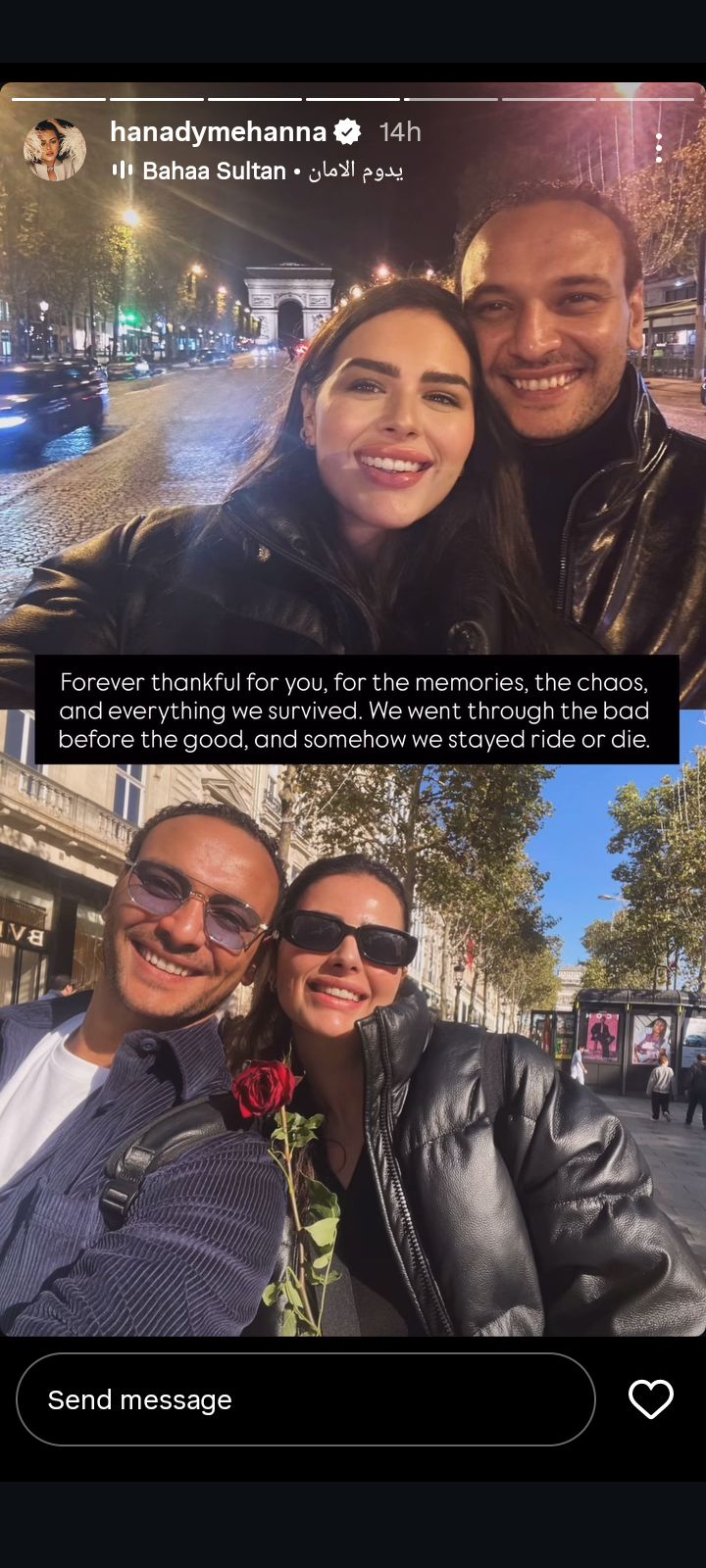 وكتبت هنادي مهنا في منشور رصده موقع تحيا مصر على حسابها الرسمي بموقع تبادل الصور والفيديوهات انستجرام ورصدها موقع تحيا مصر: ممتنة لك إلى الأبد، وللذكريات، والفوضى، وكل ما نجونا منه، لقد مررنا بالسيء قبل الجيد، وبطريقة ما بقينا، نستمر أو نموت.