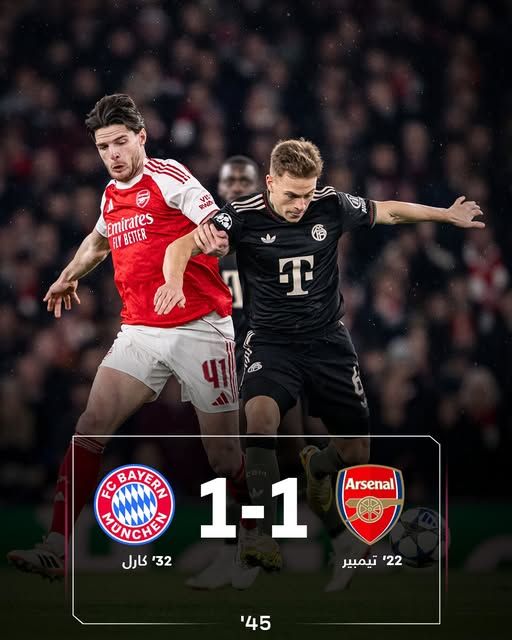 حسم التعادل الإيجابي أحداث الشوط الأول من المباراة المقامة حاليًا بين بايرن ميونخ وأرسنال في إطار منافسات دوري أبطال أوروبا.