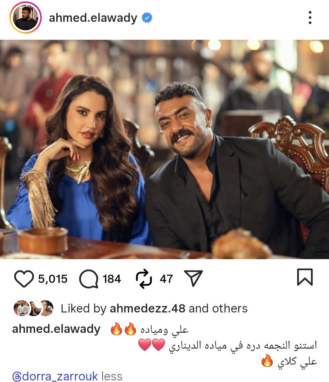 وكتب أحمد العوضي تعليقا على صورة تجمعه بالفنانة درة:" علي وميادة، استنوا النجمة درة في ميادة الديناري، علي كلاي".
