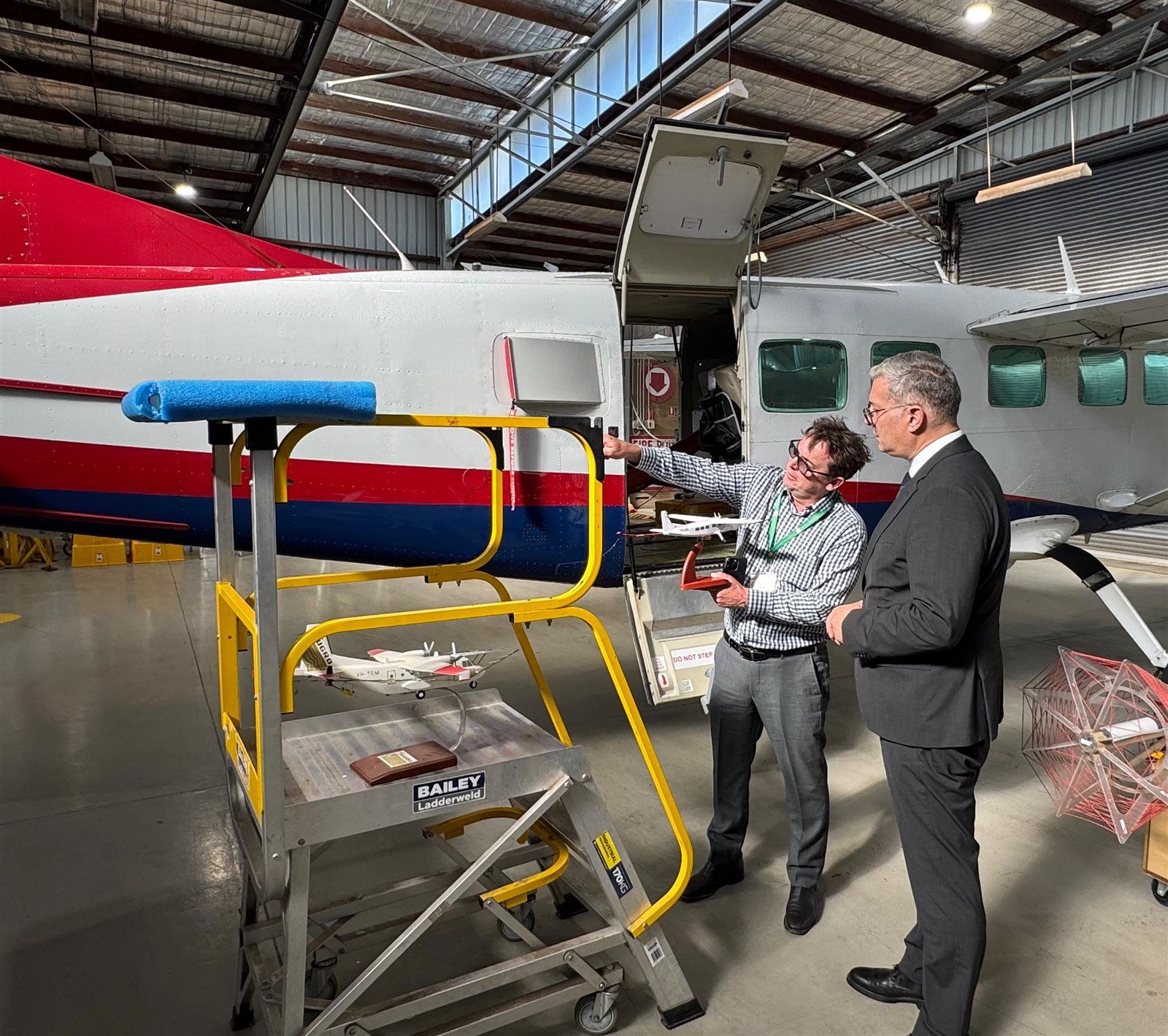 وخلال الجولة بموقع عمل الشركة، تفقد الوزير منطقة هنجر الطائرات المجهزة لتنفيذ المسح الجوي، كما تفقد المجسات المستخدمة وأنظمة بيانات الطيران وإجراءات سلامة العمليات.