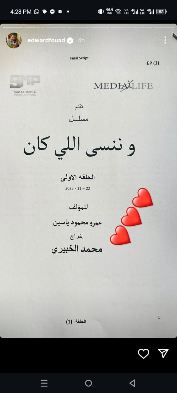وشارك الفنان إدوارد، صورة لأسكربيت مسلسل وننسى اللي كان، وفقا لما رصده موقع تحيا مصر، عبر استوري صفحته الرسمية على موقع التواصل الاجتماعي إنستجرام، معلنا بها انضمامه لفريق العمل.