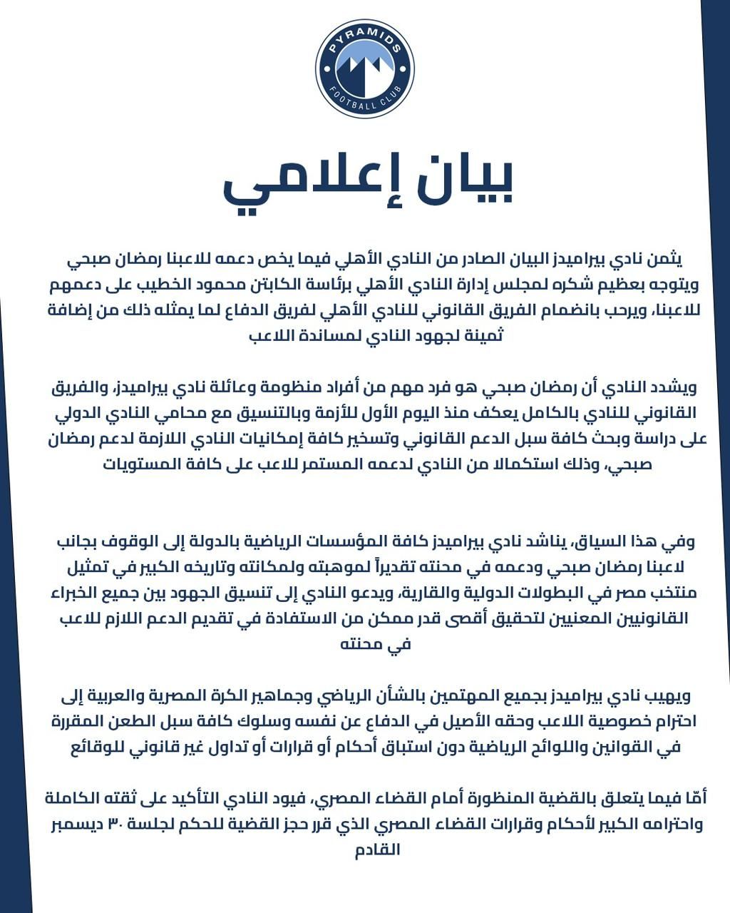 يثمن نادي بيراميدز البيان الصادر من نادي الأهلي، فيما يخص دعمه للاعبنا رمضان صبحي، ويتوجه بعظيم شكره لمجلس إدارة نادي الأهلي برئاسة الكابتن محمود الخطيب على دعمهم للاعبنا، ويرحب بانضمام الفريق القانوني لنادي الأهلي لفريق الدفاع لما يمثله ذلك من إضافة ثمينة لجهود النادي لمساندة اللاعب.