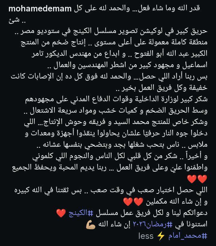 وتابع محمد إمام حديثه: الحمد لله فوق كل ده إن الإصابات كانت خفيفة وكل فريق العمل بخير، شكر كبير لوزارة الداخلية وقوات الدفاع المدني على مجهودهم وسط الحريق الضخم وكميات خشب ومواد سريعة الاشتعال، وشكر خاص للمنتج محمد السيد وفريقه وحوش الإنتاج، اللي دخلوا جوه النار حرفيًا علشان يحاولوا ينقذوا أجهزة ومعدات وملابس.. ناس بتحب شغلها بجد وبتضحي بنفسها عشانه.