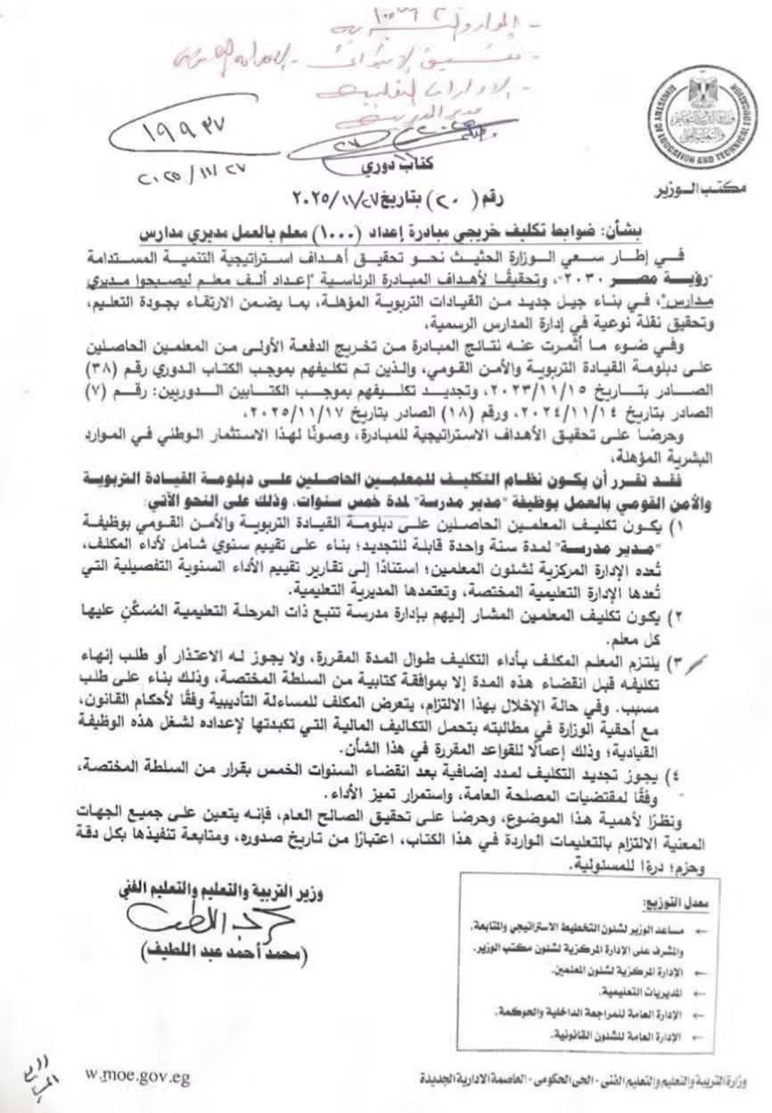 أصدرت وزارة التربية والتعليم والتعليم الفني كتابًا دوريًا جديدًا، يحمل رقم (40) بتاريخ 7 نوفمبر 2025، بشأن ضوابط تكليف خريجي مبادرة إعداد 1000 معلم بالعمل مديرين لمدارس، وذلك في إطار تنفيذ التكليفات الرئاسية بتطوير التعليم وتحقيق أهداف الإستراتيجية الوطنية المستدامة "رؤية مصر 2030"، ورفع كفاءة القيادات التربوية داخل المدارس.
