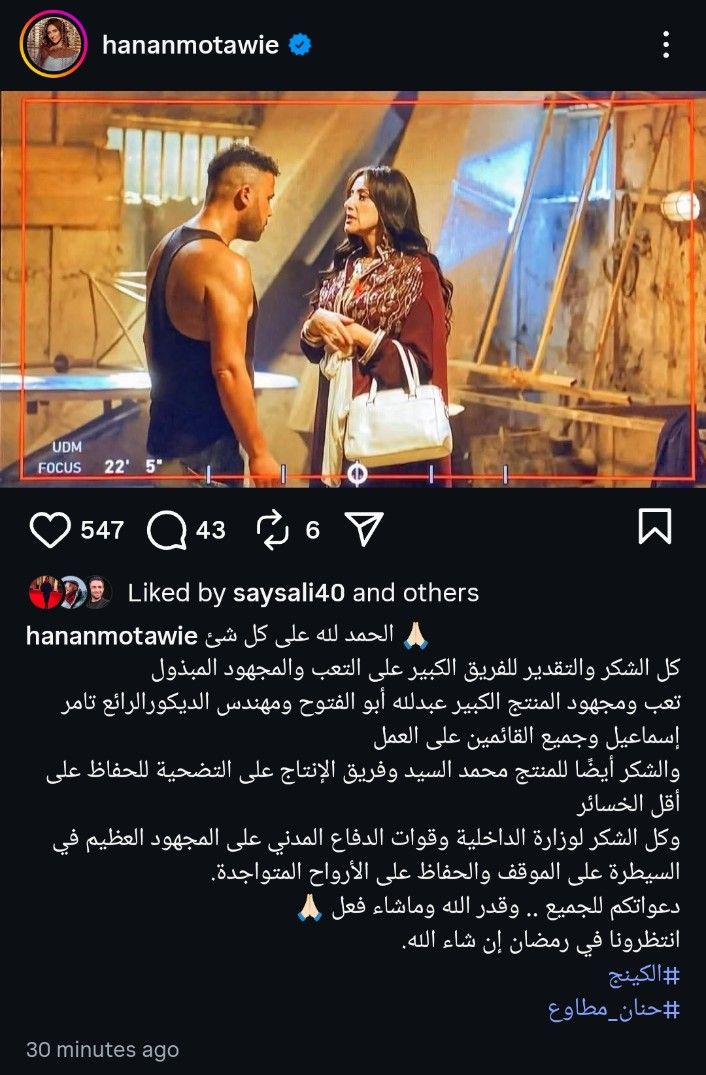 أول تعليق من حنان مطاوع على حريق لوكيشن تصوير مسلسل الكينج