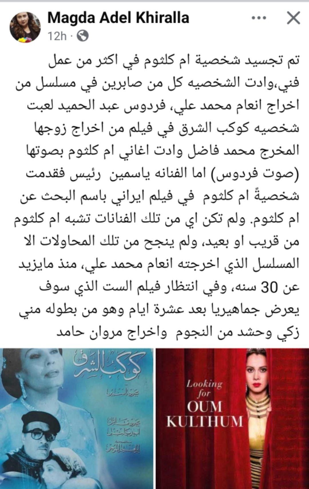 وجاء التعليق "تم تجسيد شخصية ام كلثوم في اكثر من عمل فني،وادت الشخصيه كل من صابرين في مسلسل من اخراج انعام محمد علي، فردوس عبد الحميد لعبت شخصيه كوكب الشرق في فيلم من اخراج زوجها المخرج محمد فاضل وادت اغاني ام كلثوم بصوتها (صوت فردوس) اما الفنانه ياسمين رئيس فقدمت شخصيةً ام كلثوم في فيلم ايراني باسم البحث عن ام كلثوم. ولم تكن اي من تلك الفنانات تشبه ام كلثوم من قريب او بعيد، ولم ينجح من تلك المحاولات الا المسلسل الذي اخرجته انعام محمد علي، منذ مايزيد عن 30 سنه، وفي انتظار فيلم الست الذي سوف يعرض جماهيريا بعد عشرة ايام وهو من بطوله مني زكي وحشد من النجوم واخراج مروان حامد".