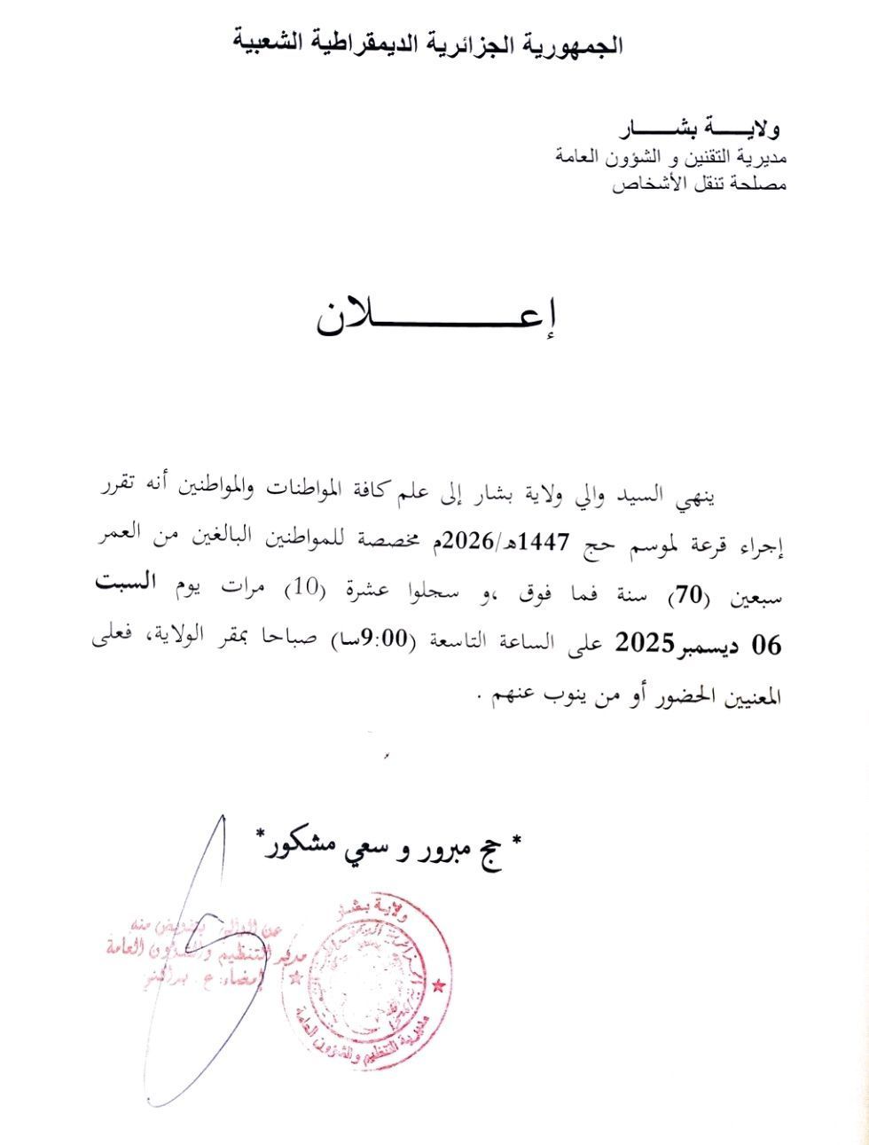 وجاء في بيان لمصالح ولاية بشار، أن والي الولاية أنهى إلى علم كافة المواطنات والمواطنين أنه تقرر إجراء قرعة لموسم حج 1447هـ /2026م مخصصة للمواطنين البالغين من العمر سبعين (70) سنة فما فوق وسجلو عشرة (10) مرات يوم السبت 06 ديسمبر 2025 على الساعة التاسعة (9:00 سا) صباحا بمقر الولاية.
