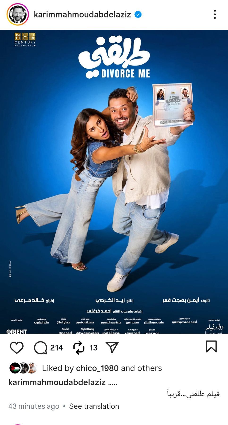 وكتب كريم تعليقا على البوستر عبر حسابه الرسمي على تطبيق “إنستجرام”:" فيلم طلقني قريبا".