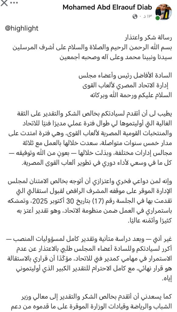 وأضاف البيان أن مجلس الإدارة يؤكد أنه لم يوافق على استقالته المقدمة في الجلسة رقم (17) بتاريخ 30 أكتوبر 2025، وتمسّكه الكامل باستمراره ضمن منظومة الاتحاد؛ إلا أن المجلس وانطلاقًا من تقديره واحترامه للدكتور محمد عبد الرؤف قرر قبول الاستقالة نزولًا على رغبته النهائية.