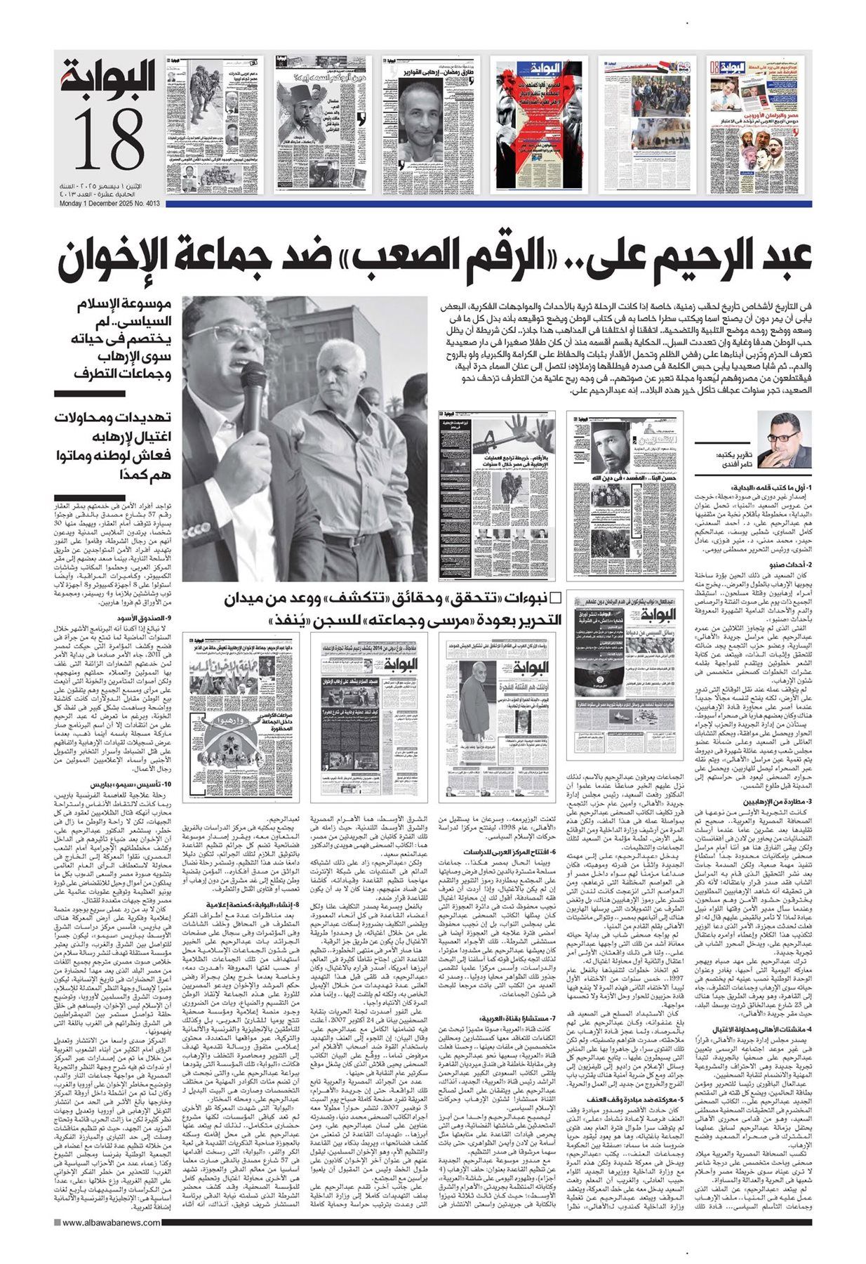 بعد مناظرات عدة مع أطراف الفكر المتطرف فى المحافل وخلف الشاشات وفى المؤتمرات وفى سجال على صفحات الجرائد بات عبدالرحيم على الخبير فى شئون الجماعات الإسلامية محل استهداف من تلك الجماعات الظلامية أو حسب لغتها المعروفة «أهدرت دمه» وخاصة بعدما خرج يعلن بجرأة رفض حكم المرشد والإخوان ويدعو المصريين للثورة على هذه الجماعة لإنقاذ الوطن من التقسيم والضياع، وبات من الضرورى وجود منصة إعلامية ومؤسسة صحفية تنتج يوميا للقارئ العربي، بل وكذلك للناطقين بالإنجليزية والفرنسية والألمانية والتركية، عبر مواقعها المتعددة، محتوى إعلامى متفوق ورسالة تقدمية تهدف إلى التنوير ومحاصرة التخلف والإرهاب، فكانت «البوابة» تلك المؤسسة التى يقودها ببراعة عبدالرحيم على، والتى نجحت فى أن تضم مئات الكوادر المهنية من مختلف التخصصات وصارت هى البيت البديل لـ عبدالرحيم على، ومحله المختار.