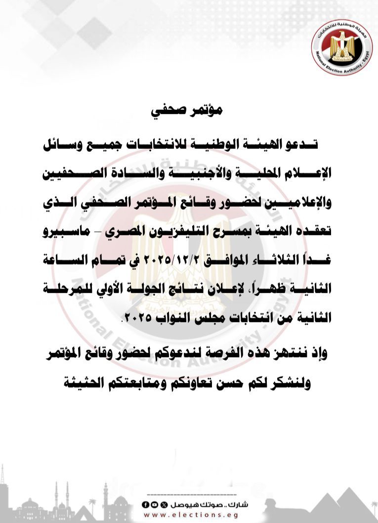 دعت الهيئة الوطنية للانتخابات، جميع وسائل الإعلام المحلية والأجنبية والصحفيين والإعلاميين، لحضور وقائع المؤتمر الصحفي الذي تعقده الهيئة بمسرح التليفزيون المصري - ماسبيرو، غدا الثلاثاء الموافق 2025/12/2 في تمام الساعة الثانية ظهراً، لإعلان نتائج الجولة الأولي للمرحلة الثانية من انتخابات مجلس النواب 2025.