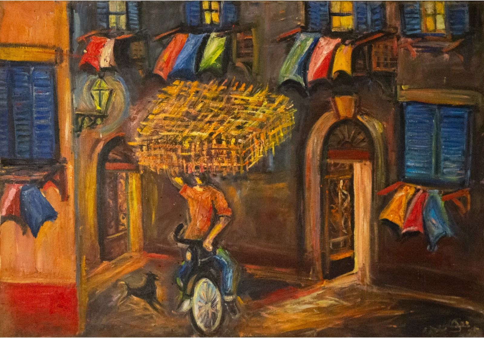 وتابع البيان: "في قلب عالم العمال التي تقوم عليه تجربته تبرز صور المعاناة ، وتحضر الرموز الشعبية المستلهمة من حي السيدة زينب حيث يعيش الفنان إلى اليوم، عملا بنصيحة وجهها إليه الفنان الكبير راغب عيّاد, شكّلت مسيرته ، فقد نصحه :" إوعى تخرج من البيئة دي… ارسم اللي بتشوفه".