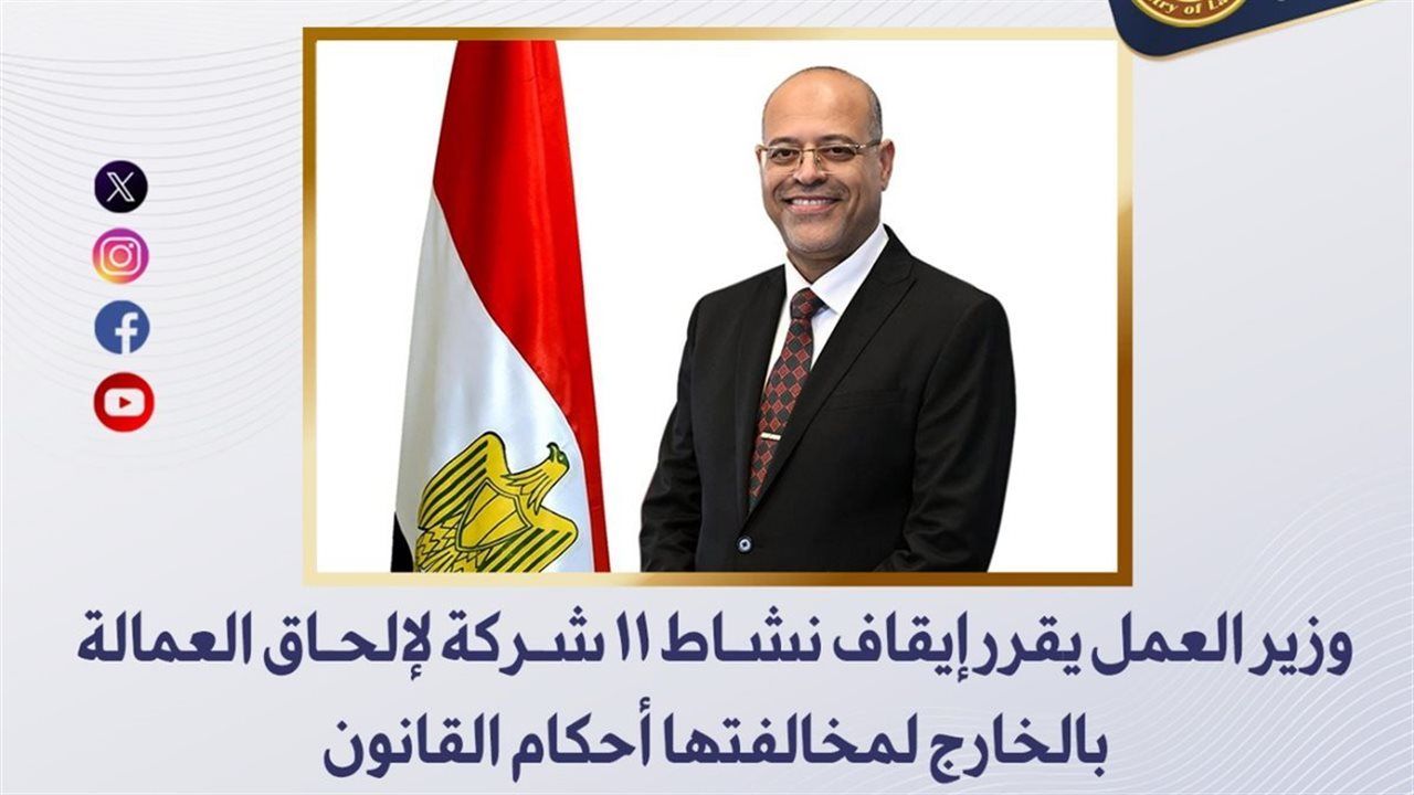 في إطار جهود وزارة العمل لضبط منظومة تشغيل العمالة المصرية بالخارج، أعلن وزير العمل محمد جبران، عن إيقاف نشاط 11 شركة لإلحاق العمالة بالخارج بعد رصد مخالفات قانونية تستوجب اتخاذ هذا الإجراء.