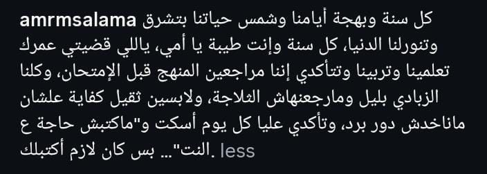 وكتب عمرو سلامة في منشور رصده موقع تحيا مصر عبر حسابها الرسمي بموقع تبادل الصور والفيديوهات انستجرام: كل سنة وبهجة أيامنا وشمس حياتنا بتشرق وتنورلنا الدنيا، كل سنة وإنت طيبة يا أمي، ياللي قضيتي عمرك تعلمينا وتربينا وتتأكدي إننا مراجعين المنهج قبل الإمتحان، وكلنا الزبادي بليل ومارجعنهاش الثلاجة، ولابسين ثقيل كفاية علشان ما ناخدش دور برد، و تأكدي عليا كل يوم أسكت و"ماكتبش حاجة على النت"... بس كان لازم أكتبلك.