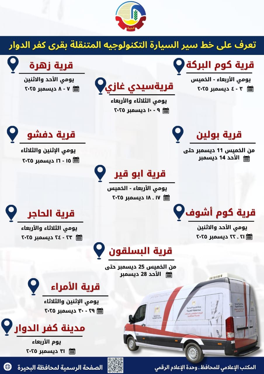 أعلنت محافظة البحيرة عن خط سير المركز التكنولوجي المتنقل على مدار شهر ديسمبر الجارى بقرى مركز كفر الدوار، تحت رعاية الدكتورة جاكلين عازر محافظ الإقليم، وفي إطار جهود المحافظة لتطوير آليات تقديم الخدمات الحكومية وتوفيرها للمواطنين في مواقعهم دون الحاجة للتنقل إلى المراكز التكنولوجية الرئيسية.
