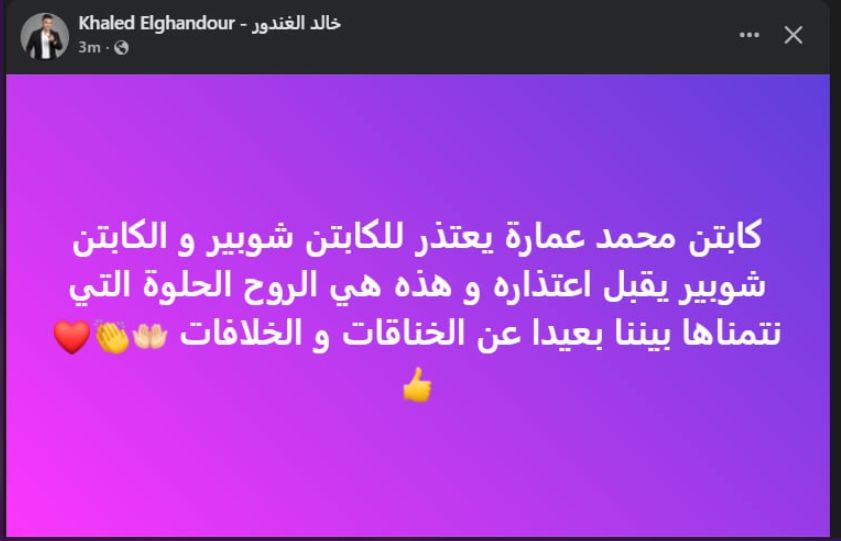 تحيا مصر، وكتب خالد الغندور عبر حسابه الرسمي"فيس بوك":" كابتن محمد عمارة يعتذر للكابتن شوبير، و الكابتن شوبير يقبل اعتذاره، و هذه هي الروح الحلوة التي نتمناها بيننا بعيداً عن الخناقات و الخلافات".