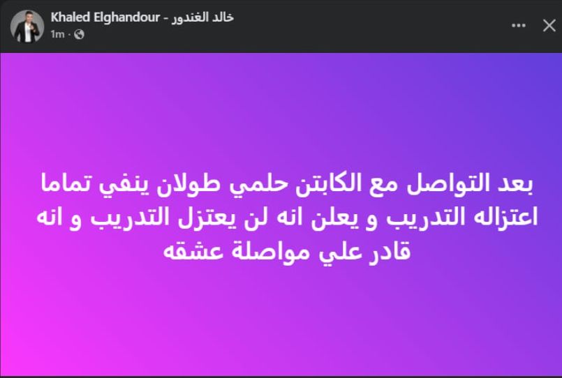 تحيا مصر، وكتب خالد الغندور عبر حسابه الرسمي"فيس بوك": بعد التواصل مع الكابتن حلمي طولان ينفي تماما اعتزاله التدريب، ويعلن إنه لن يعتزل التدريب و إنه قادر علي مواصلة عشقه".