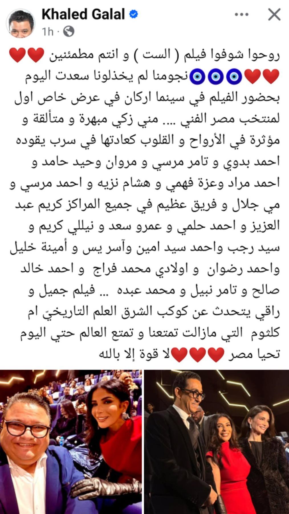 وجاءت رسائل المخرج خالد جلال "روحوا شوفوا فيلم ( الست ) وانتم مطمئنين، نجومنا لم يخذلونا سعدت اليوم بحضور الفيلم في سينما اركان في عرض خاص اول لمنتخب مصر الفني".