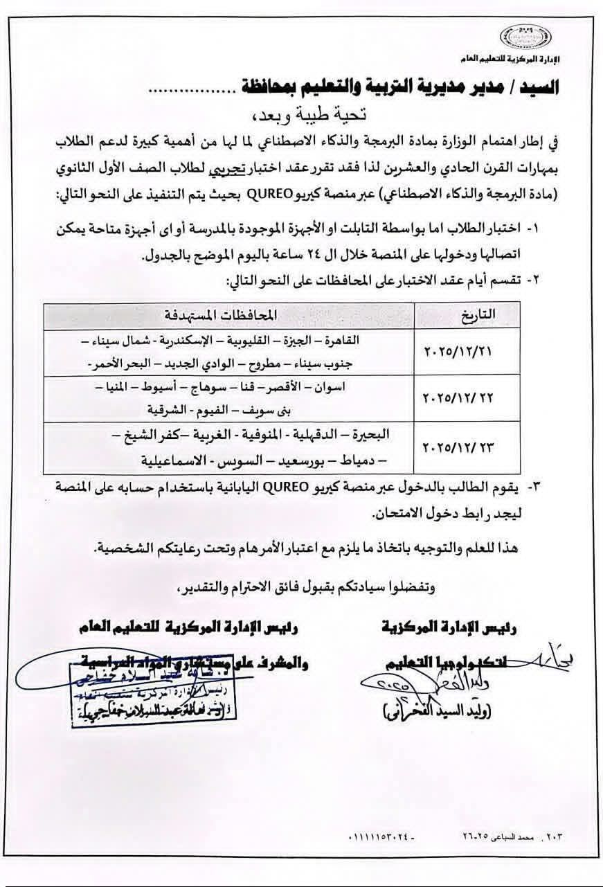 أكدت الوزارة أن الاختبار سيُعقد عن بُعد عبر منصة QUREO، وسيكون متاحًا للطلاب على مدار ٢٤ ساعة كاملة في الأيام المحددة، بحيث يُسمح لكل طالب بأداء الاختبار في الوقت الذي يناسبه خلال اليوم التجريبي الخاص بمحافظته.