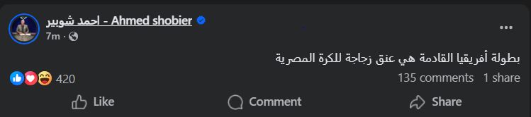 تحيا مصر، وكتب أحمد شوبير عبر حسابه الرسمي"فيس بوك": بطولة أفريقيا القادمة هي عنق زجاجة للكرة المصرية".