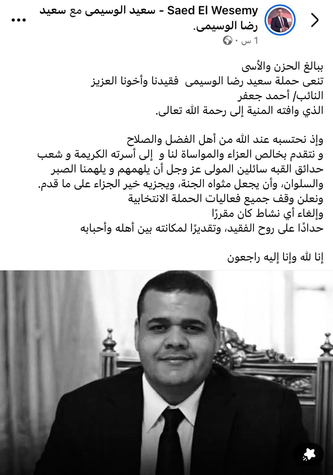 وقال سعيد الوسيمي مرشح حزب المؤتمر بدائرة حدائق القبة خلال منشور له على فيس بوك “ببالغ الحزن والأسى: ”تنعى حملة سعيد رضا الوسيمى فقيدنا وأخونا العزيز النائب/ أحمد جعفر الذي وافته المنية إلى رحمة الله تعالى. وإذ نحتسبه عند الله من أهل الفضل والصلاح و نتقدم بخالص العزاء والمواساة لنا و إلى أسرته الكريمة و شعب حدائق القبه سائلين المولى عز وجل أن يلهمهم و يلهمنا الصبر والسلوان، وأن يجعل مثواه الجنة، ويجزيه خير الجزاء على ما قدم. ونعلن وقف جميع فعاليات الحملة الانتخابية وإلغاء أي نشاط كان مقررًا حدادًا على روح الفقيد، وتقديرًا لمكانته بين أهله وأحبابه،إنا لله وإنا إليه راجعون".