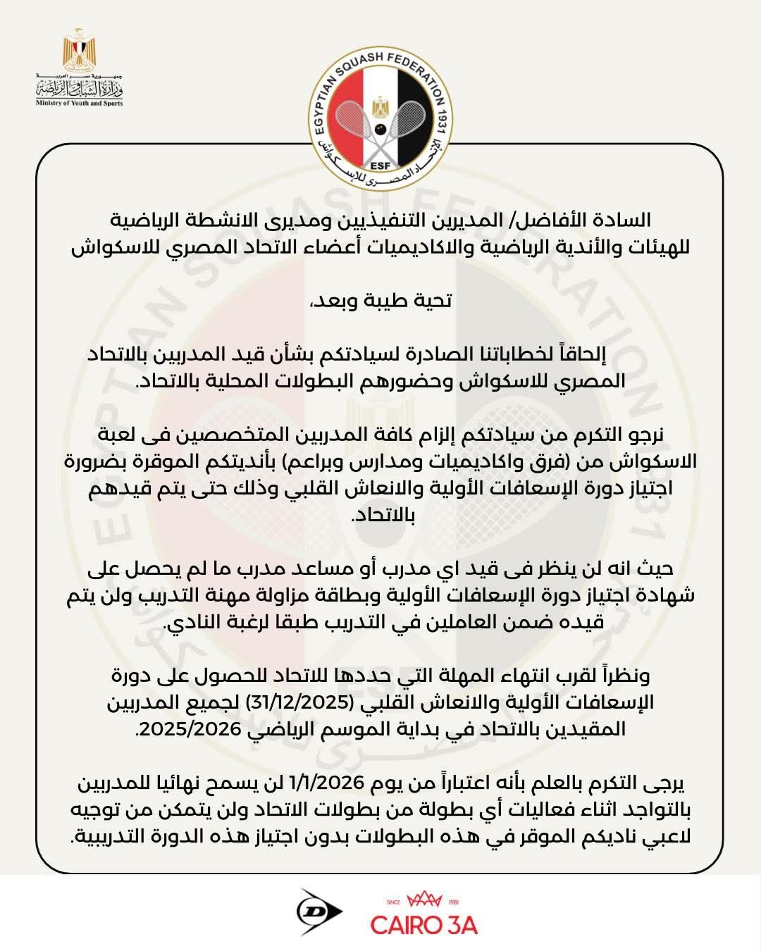 وأشار الاتحاد المصري للاسكواش إلى أن المهلة المحددة للحصول على الدورة، والتي تنتهي في 31 ديسمبر 2025، أوشكت على الانتهاء، وذلك بالنسبة للمدربين المقيدين في بداية الموسم الرياضي 2025/2026.