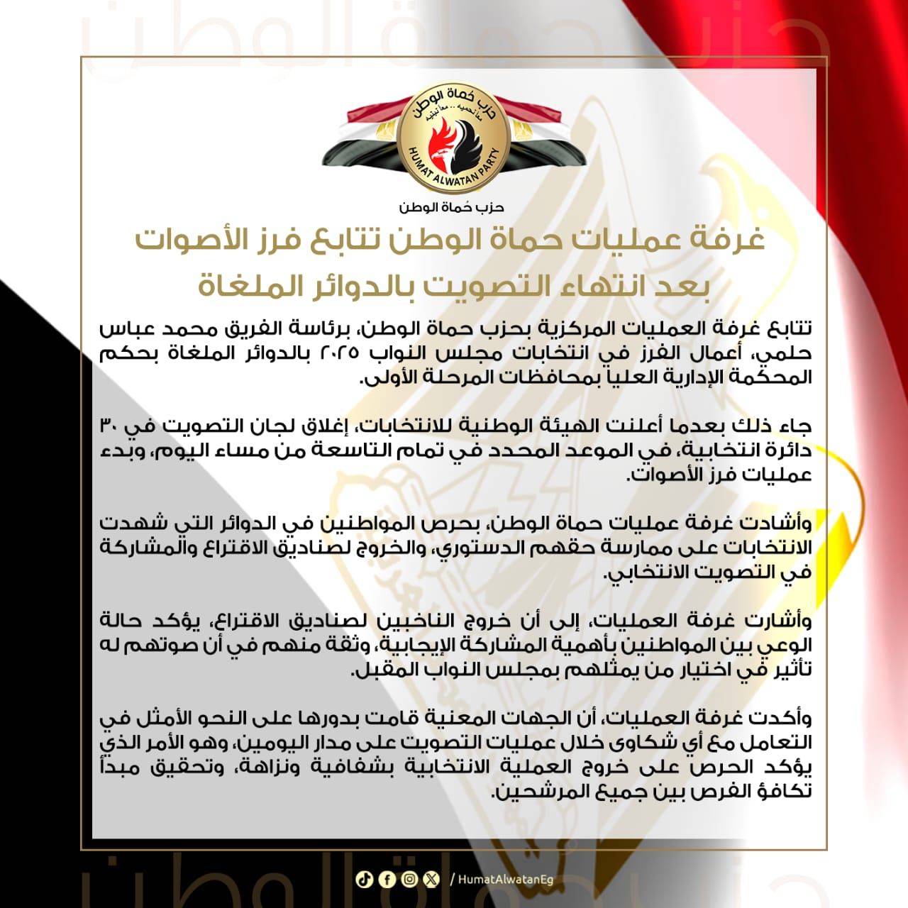 غرفة عمليات حماة الوطن تتابع فرز الأصوات بعد انتهاء التصويت بالدوائر الملغاة