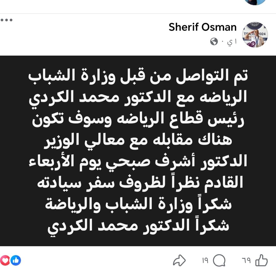 واختتم عثمان منشوره بتوجيه الشكر إلى وزارة الشباب والرياضة، والدكتور محمد الكردي، على سرعة التواصل والاستجابة.