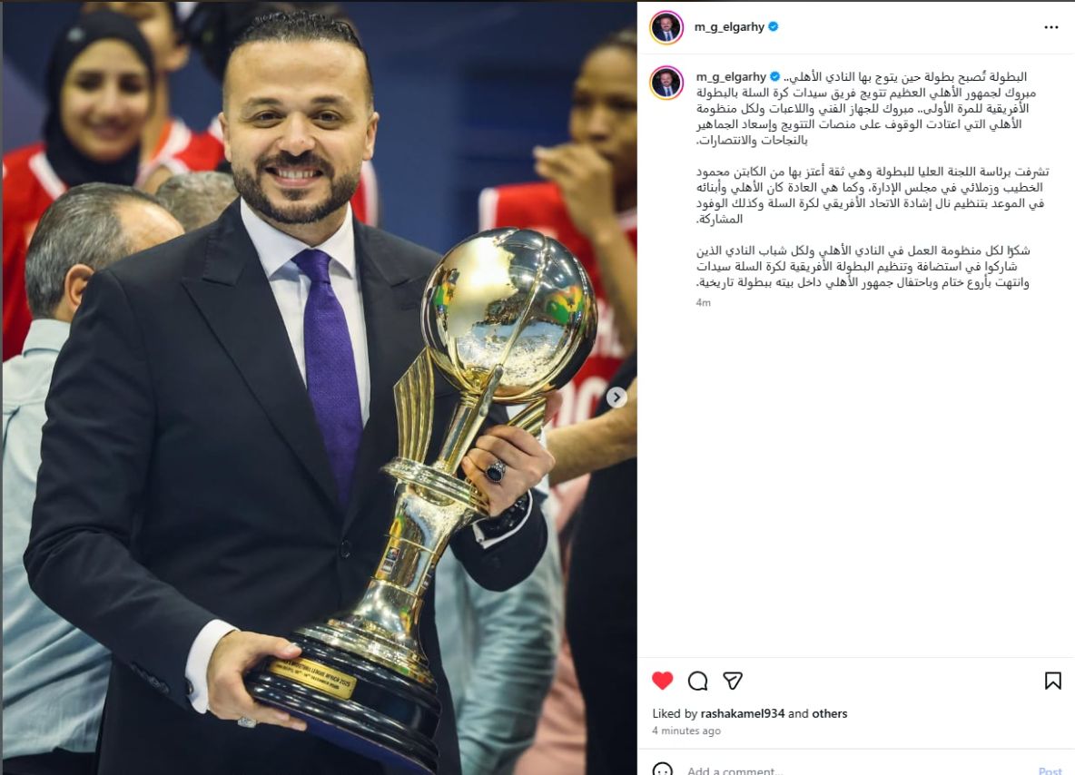 تحيا مصر، وكتب محمد الجارحي عضو مجلس إدارة النادي الأهلي، عبر حسابه الرسمي"إنستجرام": البطولة تُصبح بطولة حين يتوج بها النادي الأهلي.. مبروك لجمهور الأهلي العظيم تتويج فريق سيدات كرة السلة بالبطولة الأفريقية للمرة الأولى.. مبروك للجهاز الفني واللاعبات ولكل منظومة الأهلي التي اعتادت الوقوف على منصات التتويج وإسعاد الجماهير بالنجاحات والانتصارات".