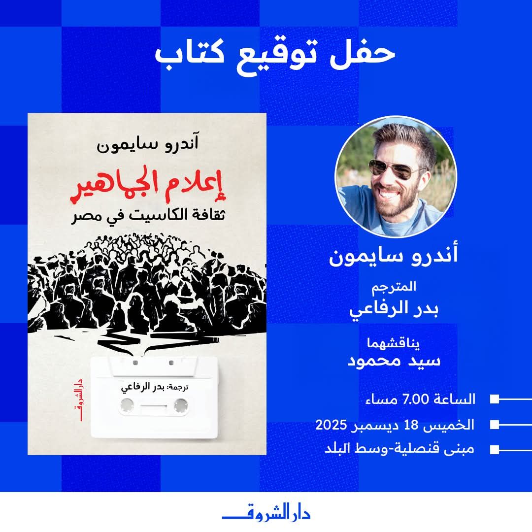 تنظم دار الشروق للنشر والتوزيع، مساء الخميس 18 ديسمبر 2025 في تمام الساعة 7 مساءً، حفل توقيع ومناقشة كتاب «إعلام الجماهير: ثقافة الكاسيت في مصر» للمؤرخ والباحث الأمريكي آندرو سايمون، وذلك في مبنى قنصلية بوسط البلد.