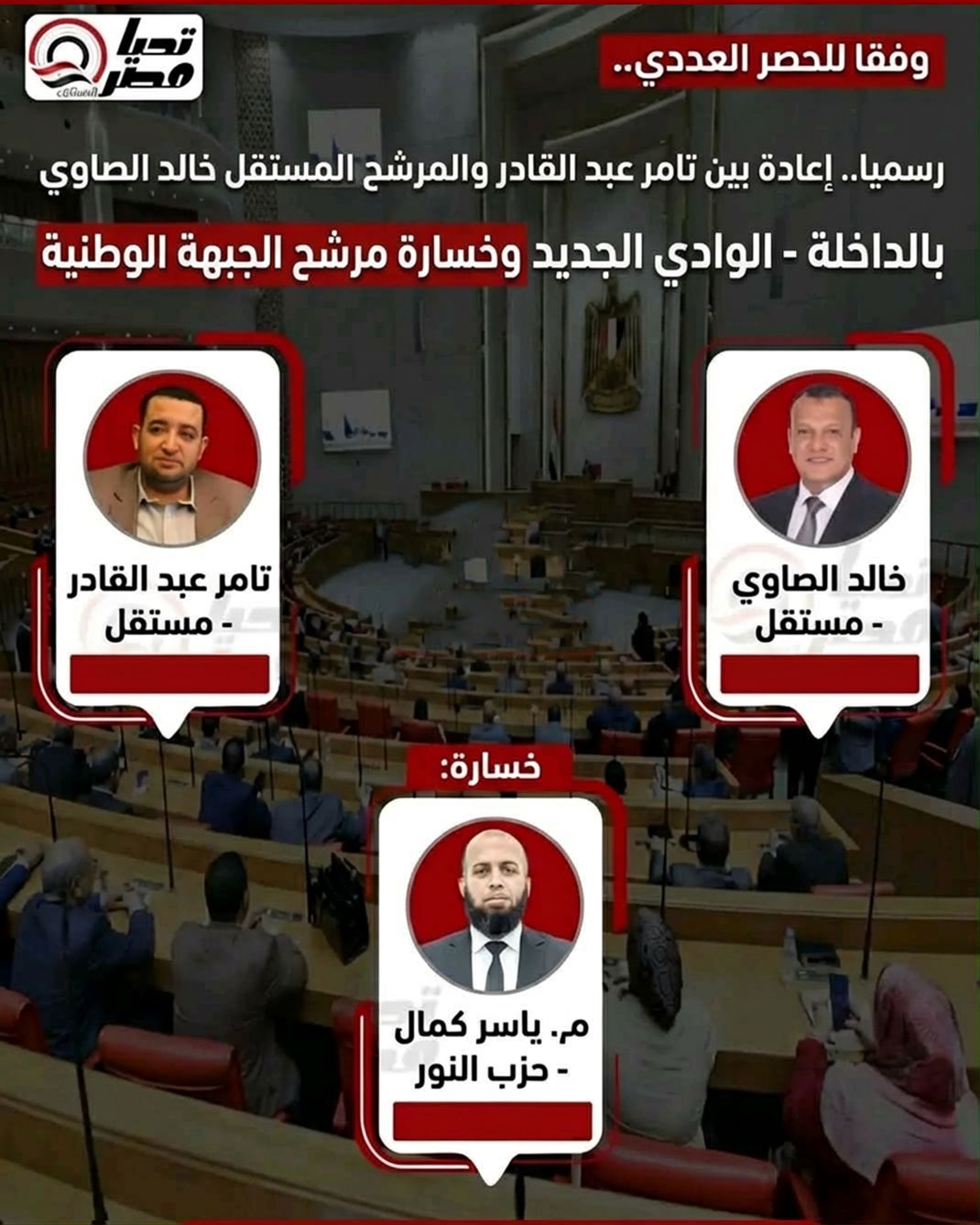 المرشح المستقل خالد الصاوي، وشهدت الدائرة خسارة المهندس ياسر كمال مرشح حزب النور، وخسارة مرشح الجبهة الوطنية.