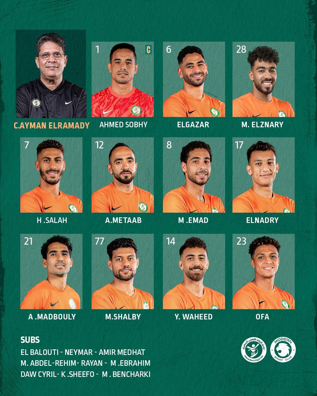 ويجلس على مقاعد البدلاء: عبدالعزيز البلعوطى، محمد إبراهيم، سيد نيمار، محمد بن شرقي، أحمد ريان، أمير مدحت، داو سيريل، خالد شيفو، مصطفى عبدالرحيم.