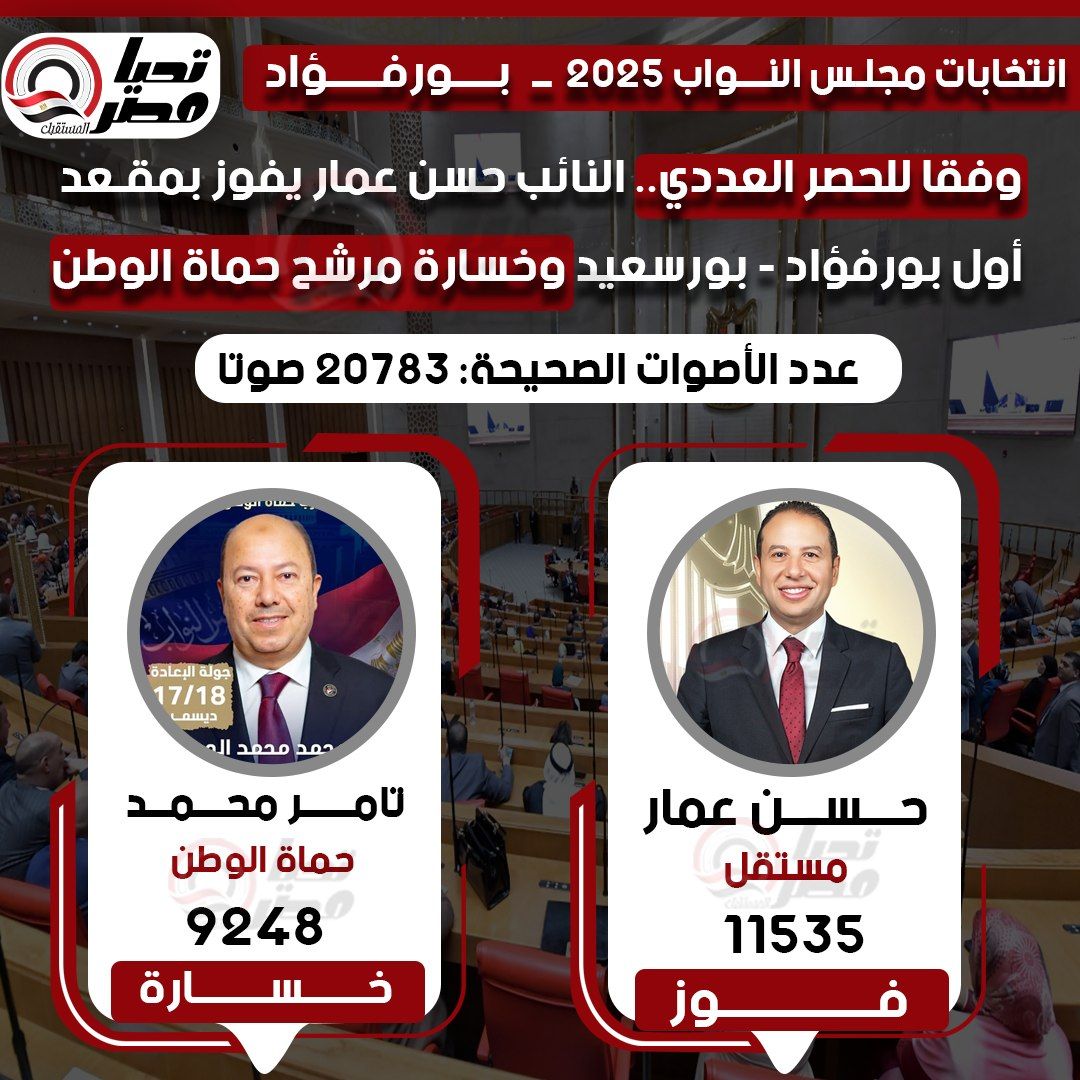 أصفر الحصر العددي في دائرة بورفؤاد بمحافظة بورسعيد عن فوز المرشح حسن عمار المرشح المستقل بالمقعد المخصص للدائرة داخل مجلس النواب في دورته الثالثة.