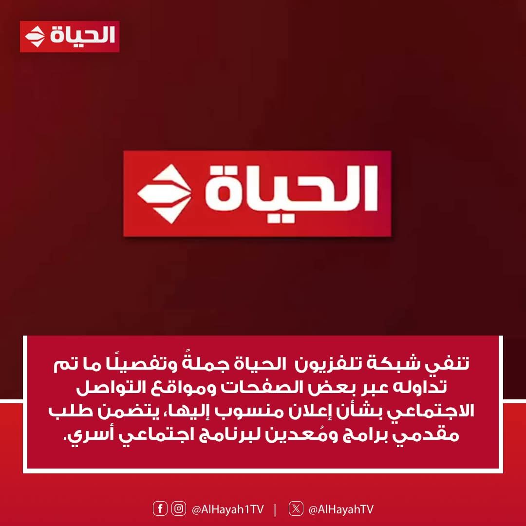 أصدرت شبكة تلفزيون الحياة بيانًا رسميًا حذّرت فيه من تداول إعلان غير صحيح نُسب إليها خلال الساعات الماضية عبر بعض الصفحات على مواقع التواصل الاجتماعي، تضمن مزاعم عن طلب مقدمي برامج ومُعدين للعمل في برنامج اجتماعي أسري.