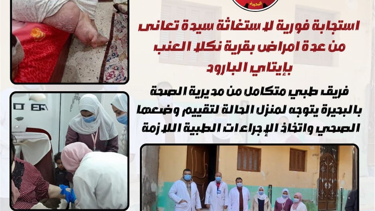 جاء ذلك في ضوء ما تم تداوله على مواقع التواصل الاجتماعي بشأن سيدة من قرية نكلا العنب بمركز إيتاي البارود، تعاني من أمراض متعددة، تمثلت في التهاب رئوي، وتليف كبدي، وفشل في وظائف التنفس، سمنة مفرطة ،كما أنها قعيدة منذ سنوات، مما يستلزم رعاية طبية عاجلة.